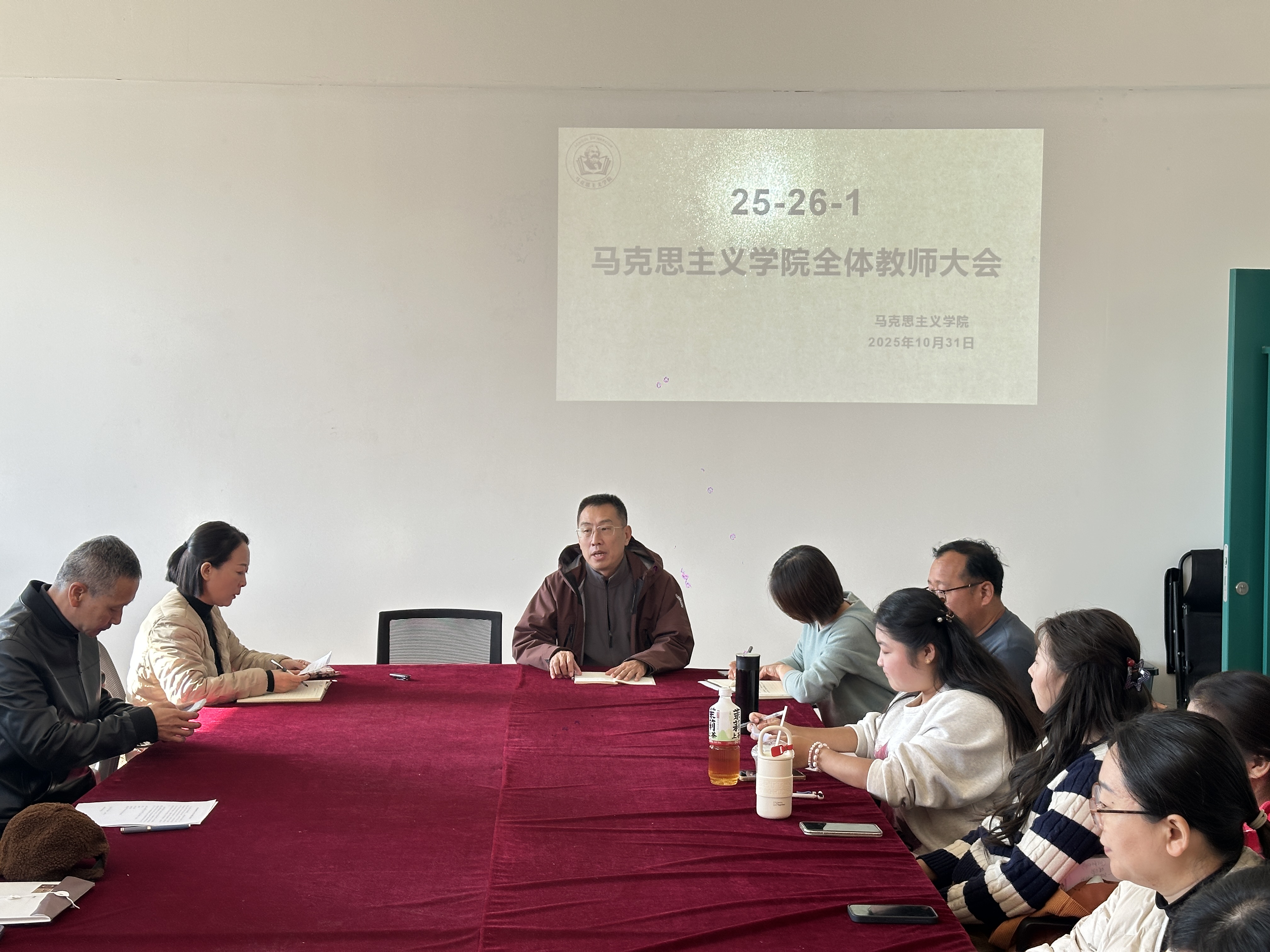 为扎实推进期中教学检查工作,全面总结线上审核评估情况,全力备战专家入校评估,并明确后续教学科研重点任务,2025 年10月31日中午12:30,马克思主义学院在 B601 会议室召开2025-2026 学年第一学期全体教师大会。会议由学院院长臧平主持,全院教师共同参会。