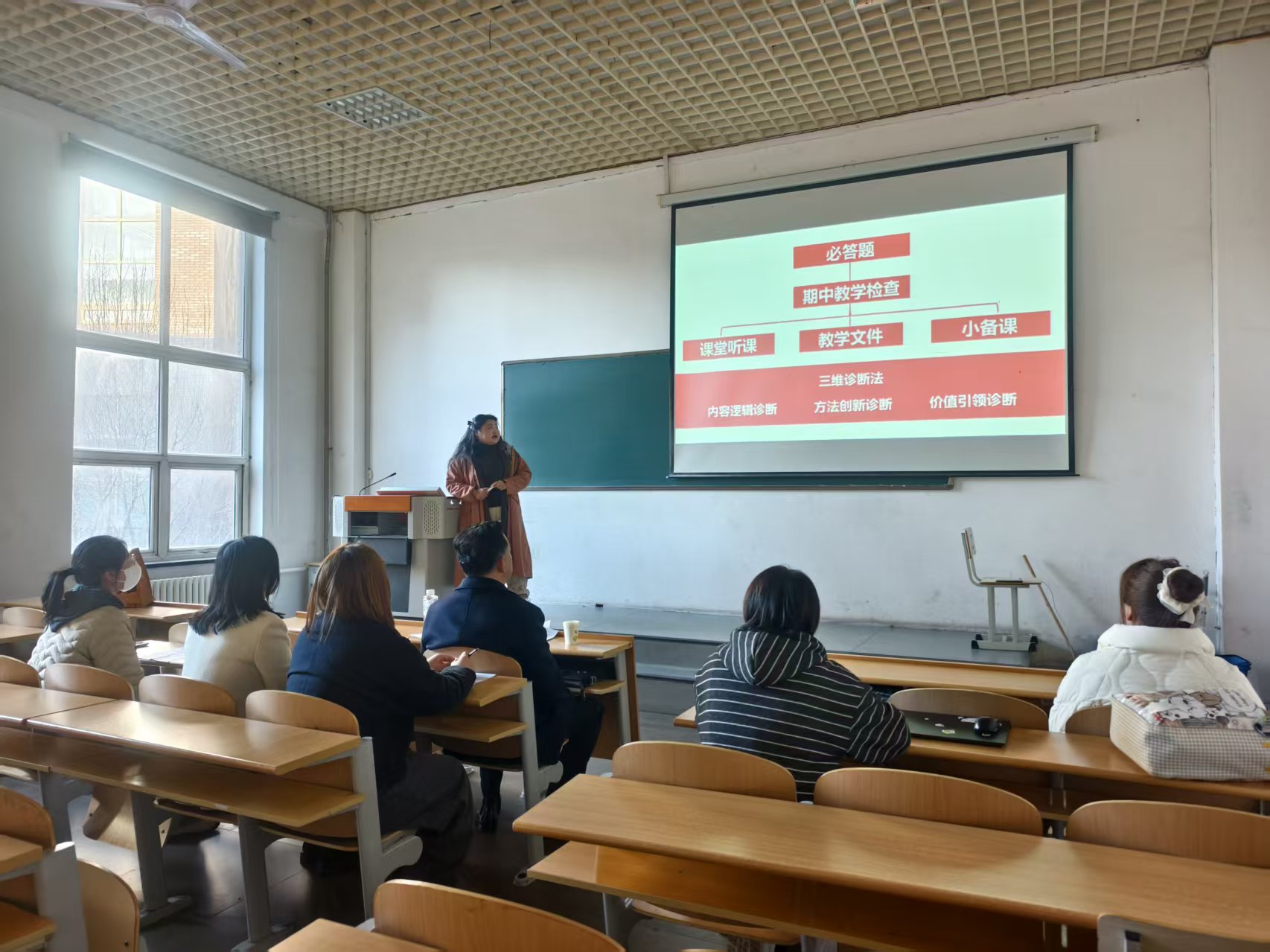 聚焦“必答题”:以“双轮备课+三维诊断”精准画像应难题。教学改革首在直面真问题。备课会结合日常“小备课”反馈与“大备课”共研成果,梳理出教研室目前痛点问题——全会精神讲解与《马克思主义基本原理》《思想道德与法治》等主干课程理论衔接不足。对此,教研室创新“双轮备课”机制:“小备课”聚焦微观痛点,通过“现场听课—即时反馈—命题作业”捕捉细节疏漏;“大备课”攻坚宏观堵点,周期性研讨共性问题,形成“问题清单—对策方案—教学转化”闭环。同步运用“三维诊断法”深化教学改革:内容逻辑上,以“历史方位—制度优势—青年使命”重构框架,将经济数据等转化为“新发展理念落地”的理论注脚;方法创新上,引入《马克思主义基本原理》“矛盾分析法”,引导辩证理解政策逻辑;价值引领上,强化“理论—价值”双传递,链接《思想道德与法治》“个人理想与社会理想统一”导向,实现“以课促课、以理铸魂”。