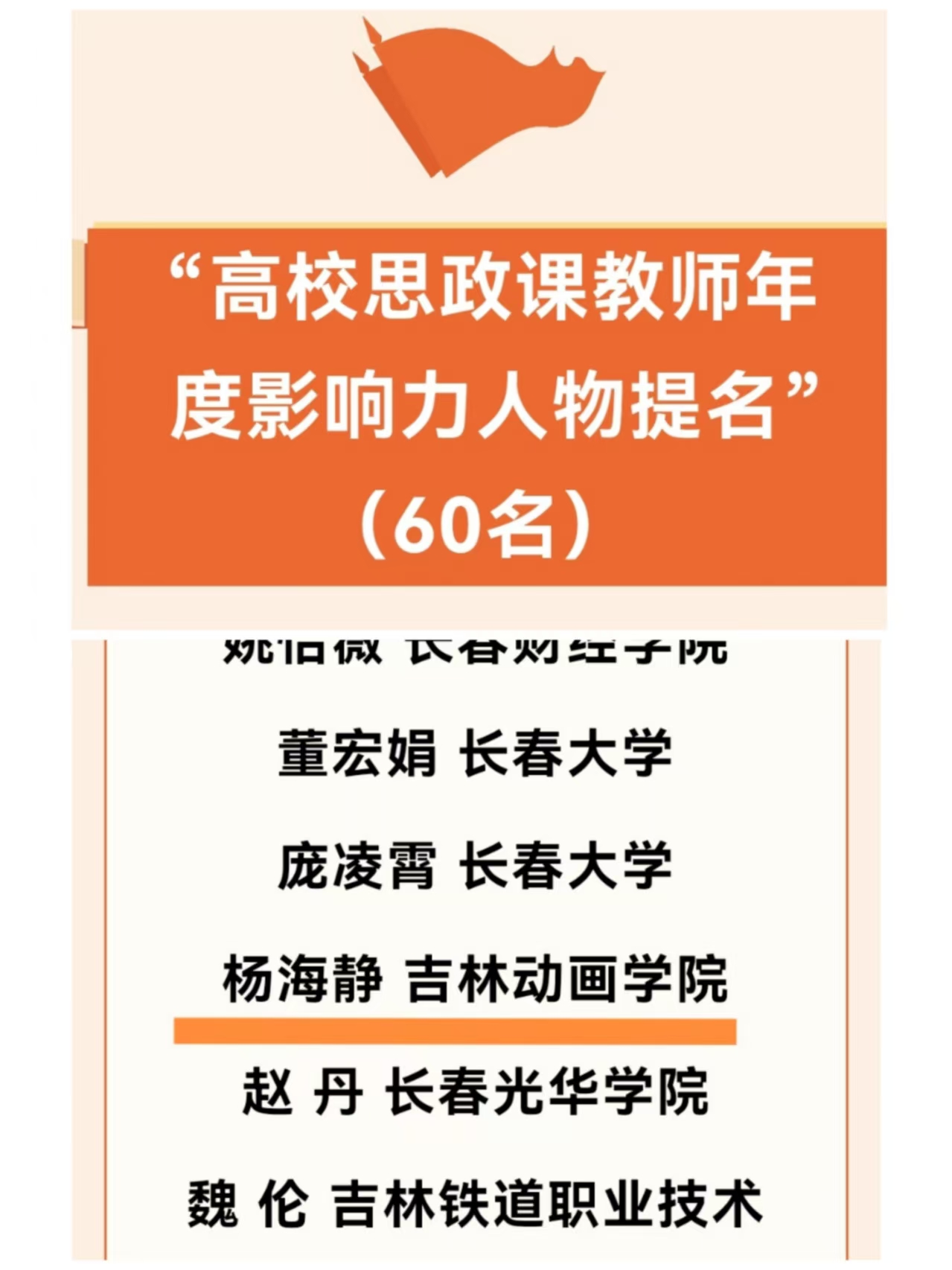 近日,吉林省教育厅组织开展了2025年吉林省“高校思政课教师年度影响力人物”推选展示活动,马克思主义学院杨海静获2025年吉林省“高校思政课教师年度影响力提名人物”称号。