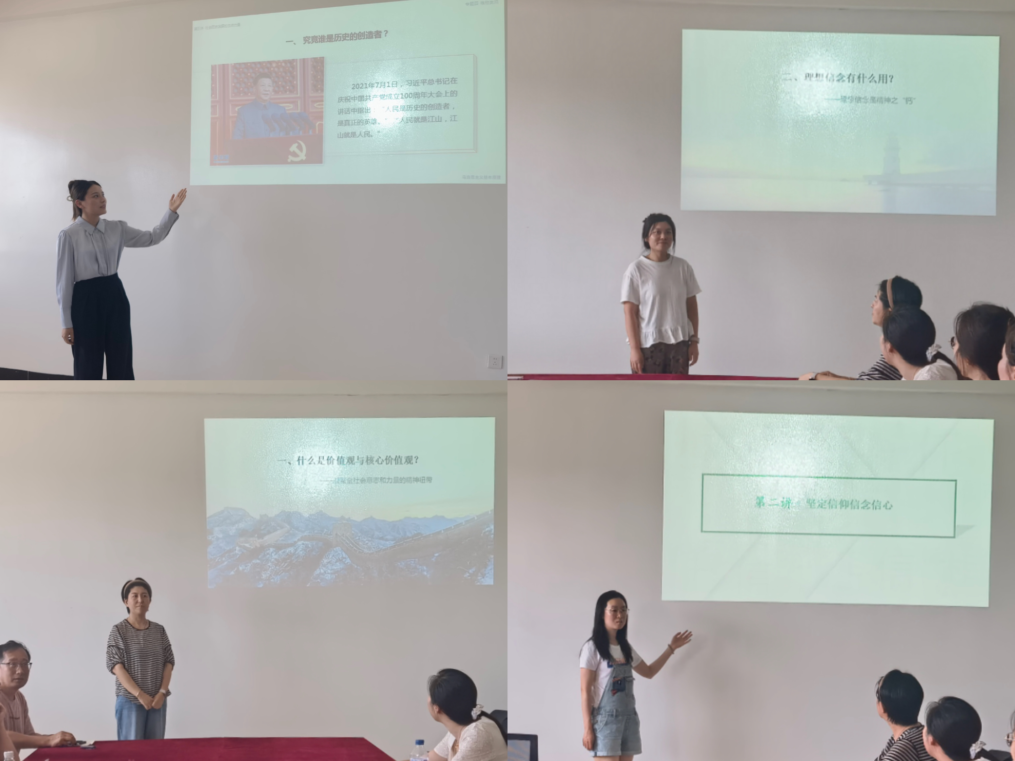 随后四位思政课教师进行了教学展示。王雅萍老师以“人民群众是历史的创造者”为主题进行教学展示,通过融入我国科技、文化领域的最新案例,引导学生掌握历史唯物主义的基本原理,认同马克思主义群众观点和党的群众路线;张娜娜老师以“凝聚全社会意志和力量的精神纽带”为主题,以“中国精神”为主线,通过脱贫攻坚案例和航天精神等生动素材,引导学生理解社会主义核心价值观如何凝聚14亿人的奋斗力量;盛烨老师以“理想信念是精神之‘钙’”这一教学内容,结合黄文秀、钱学森等时代楷模案例,采用小组讨论与“人生愿景图”互动活动,深刻阐释理想信念缺失的“软骨病”危害,强调坚定信仰对个人成长与社会发展的双重意义;高楠老师在“坚定信仰信念信心”这一内容讲解时,通过“百年党史微纪录片”切入,引导学生从红船精神、脱贫攻坚等案例中感悟信仰力量。采用“情境辩论+榜样故事”的互动模式,结合张桂梅、航天团队等鲜活事例,剖析理想信念与个人价值的辩证关系。