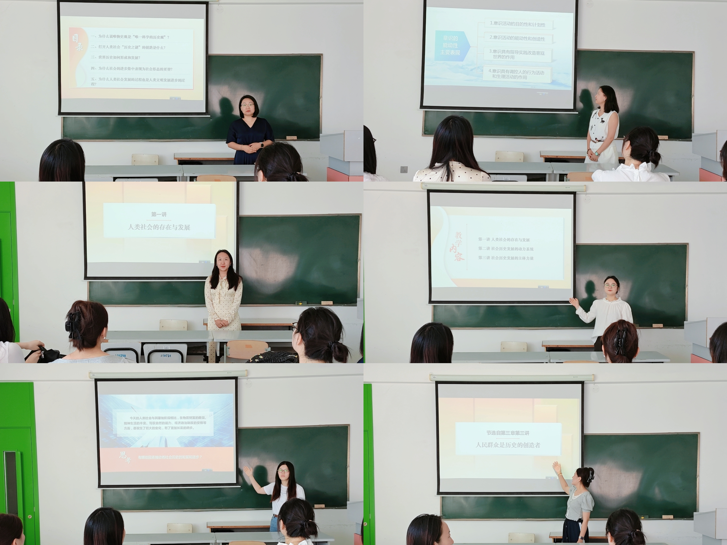 在教学展示环节中,教师精心设计,结合热点,紧扣主题。陈曦老师讲授“人类社会的存在与发展”,运用跨学科结合的创新模式,通过对鲁迅《“硬译”与“文学的阶级性”》片段分析,从文学角度反应人的情感很难脱离人的生活实践、人的物质生活条件;付瑶老师讲授“社会主义五百年的历史进程”,通过对比社会主义发展道路的多样性,旨在使学生正确认识21世纪世界社会主义的形势,了解中国特色社会主义的成功实践对世界社会主义发展的意义;李卓君老师则结合艺术类院校学生的特点,以图画导入课程,引导学生从生活世界出发思考世界的本质问题、人与世界的关系问题以及在探索世界的问题上哲学与其他学科的区别问题;王若实老师充分结合当下热点,通过“流行语”这样的社会意识,管窥社会存在,提升学生的兴趣。除此之外,新教师王雅萍与骨干教师张晶也分别进行了教学展示。