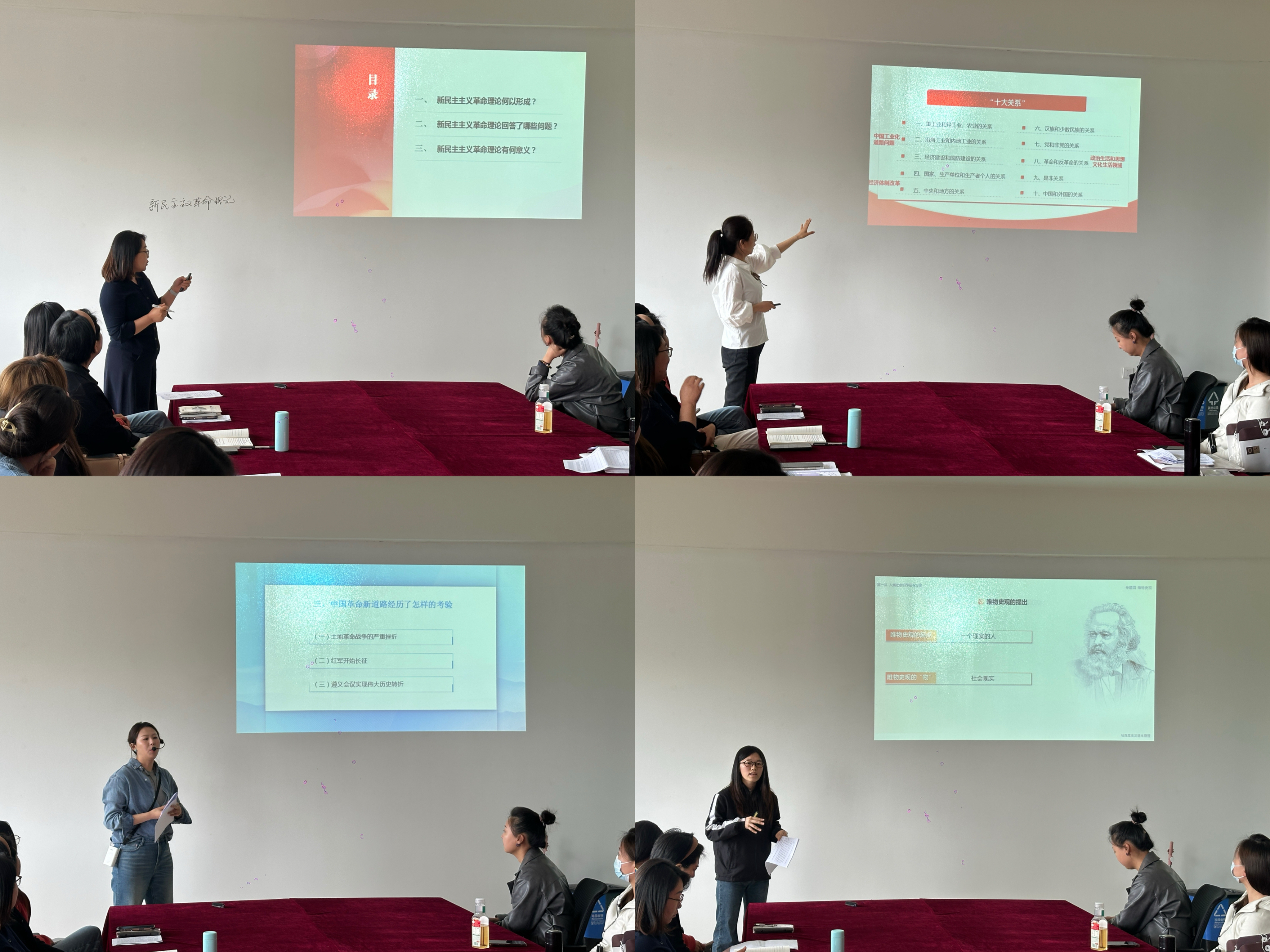 陈曦老师通过阐释唯物史观,强调了实践在马克思主义哲学中的重要地位;刘舒老师通过上海车展案例,介绍了社会主义建设道路初步探索的理论成果;张晶老师围绕新民主主义革命理论,讲述了其形成的国情依据。
