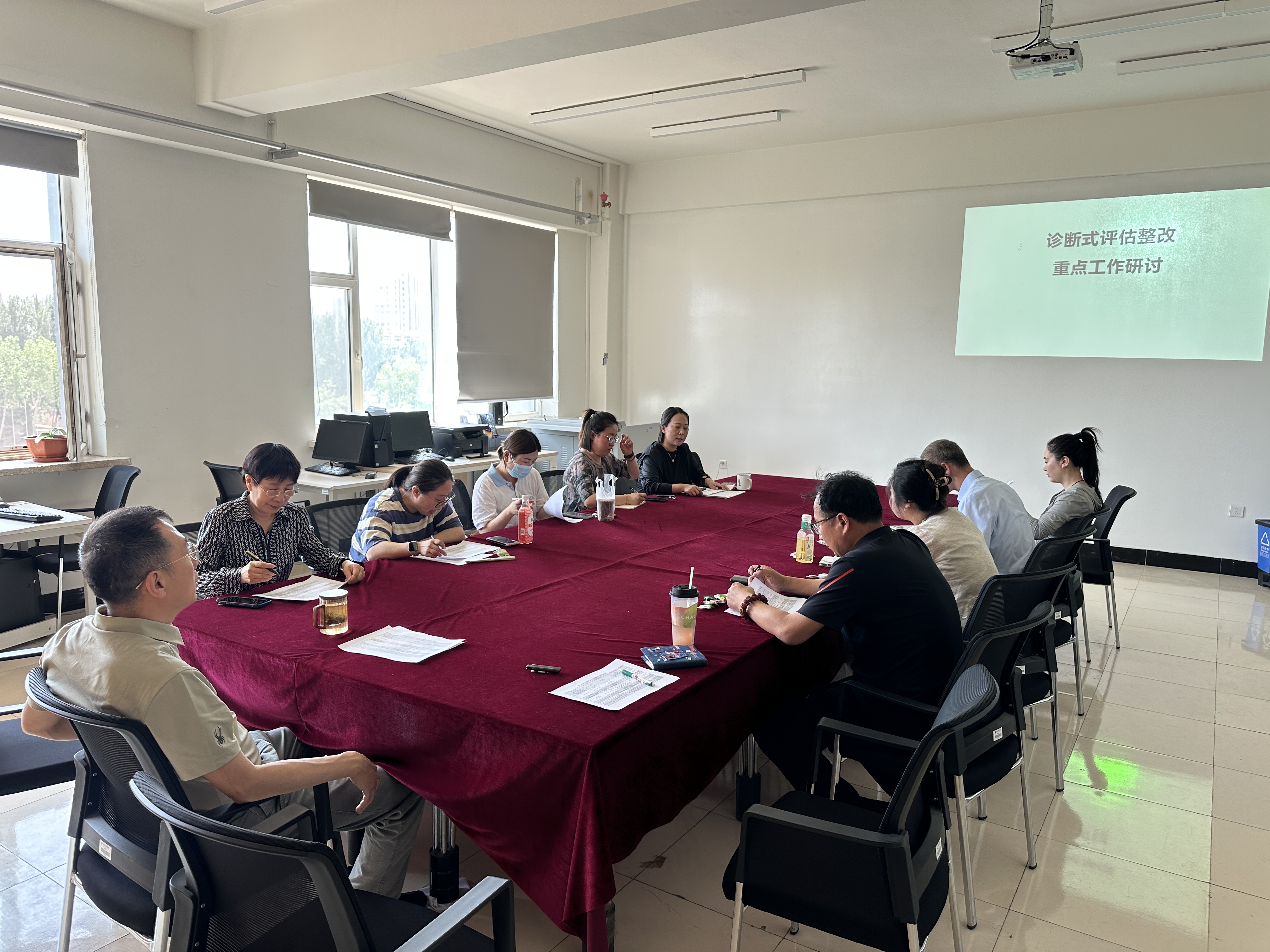2025年6月13日12:30,马克思主义学院在B601会议室召开诊断式评估整改工作院务会,会议由臧平院长主持,孙颖副院长、教学督导陈桂艳及各教研室主任参会,会议围绕评估整改与教学规范展开部署。