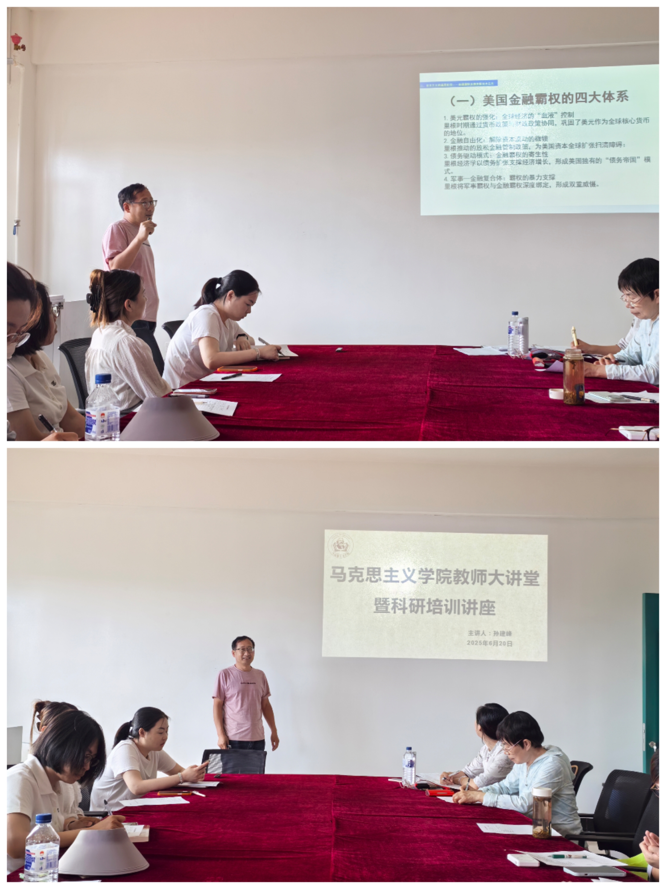 为进一步提升马克思主义学院教师的科研素养与创新能力,激发教师开展科学研究的内生动力,2025年6月20日下午13:30,马克思主义学院在B601举办教师大讲堂暨科研系列讲座活动。此次讲座由中国近代史纲要教研室孙建峰主任主讲,题目为“美国金融垄断资本主义的产生、本质、特征与终结”。讲座由马克思主义学院副院长孙颖主持,马克思主义学院全体教师参加。