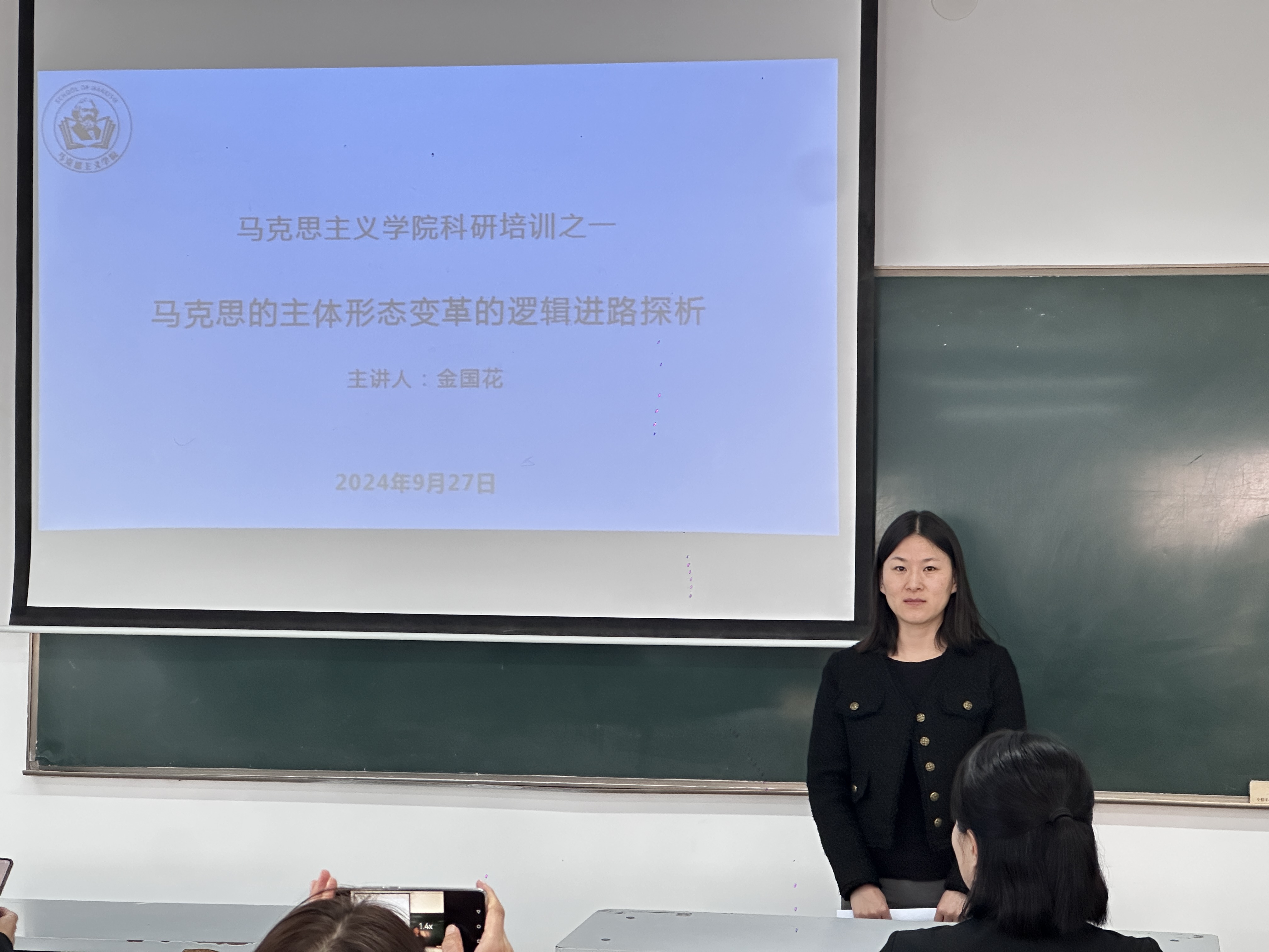 为了营造良好的学术氛围,发挥学院高学历人才资源优势,2024年9月27日13:40在B534教室马克思主义学院举行学术讲座。讲座由学院专任教师、吉林大学在读博士金国花老师主讲,题为“马克思的主体形态变革的逻辑进路探析”,全体教师参会学习交流。
