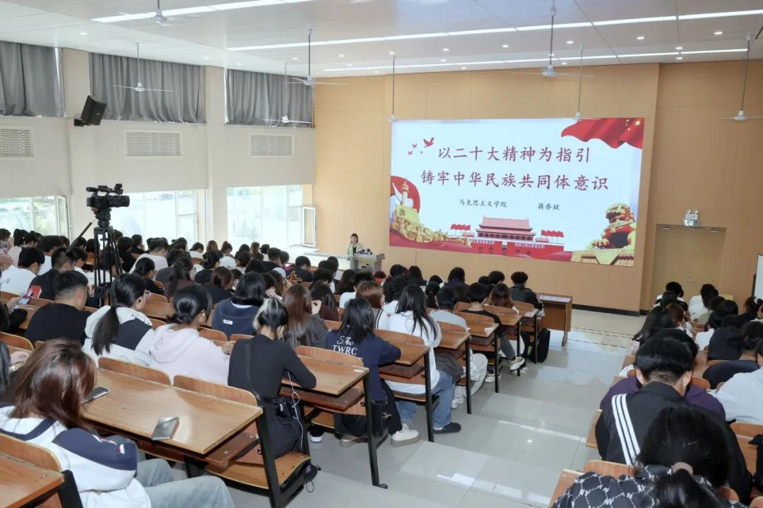 为深入学习贯彻习近平总书记关于加强和改进民族工作的重要思想,营造铸牢中华民族共同体意识教育的浓厚氛围,引导广大师生深入理解中华民族共同体的深刻内涵,培养同学们的爱国情怀、增强民族凝聚力,按照省教育厅等十部门《关于加强学校铸牢中华民族共同体意识教育实施方案》部署,结合我校铸牢中华民族共同体意识教育活动月方案,2024年9月27日下午13:30在A422多媒体教室,我校举办了题为“以二十大精神为指引,铸牢中华民族共同体意识”的专题讲座。该讲座由学校马克思主义学院教师蒋乔欣主讲,全校400余名师生代表参加。