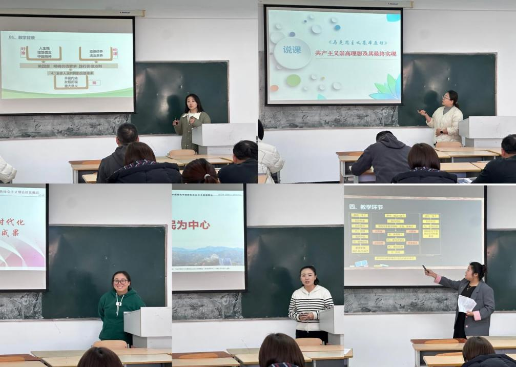 随后,五位教师分别从思想道德与法治、马克思主义基本原理、毛泽东思想和中国特色社会主义理论体系概论、习近平新时代中国特色社会主义思想概论、形势与政策课程角度进行了说课。教师从学情分析、教学目标、重点难点、教学环节、内容设计等方面阐述了自己的教学设计思路。与会教师认真聆听,纷纷表示几位老师的说课进行了很好的引领示范,对于自身讲好一堂课给予了极大启发。