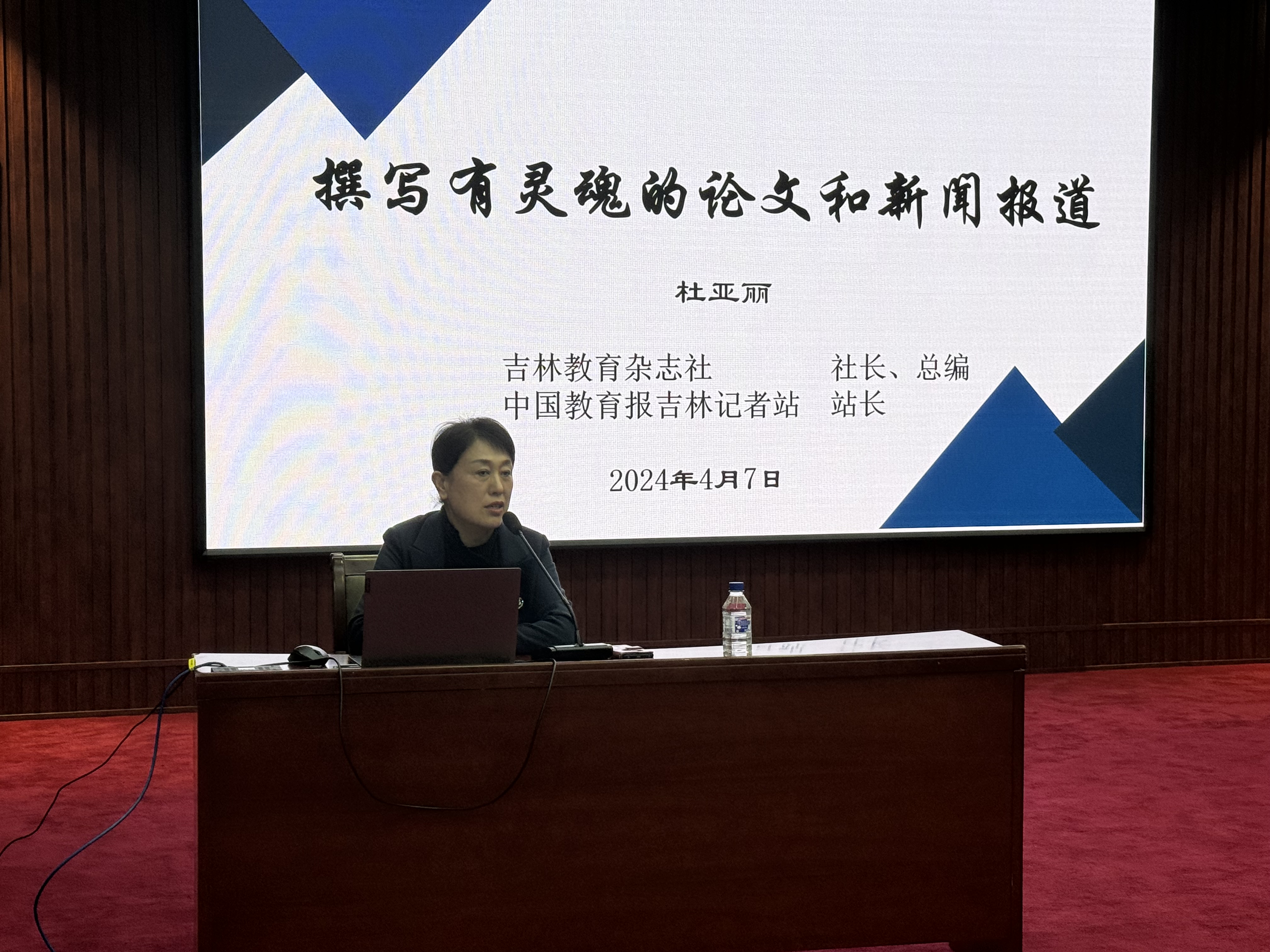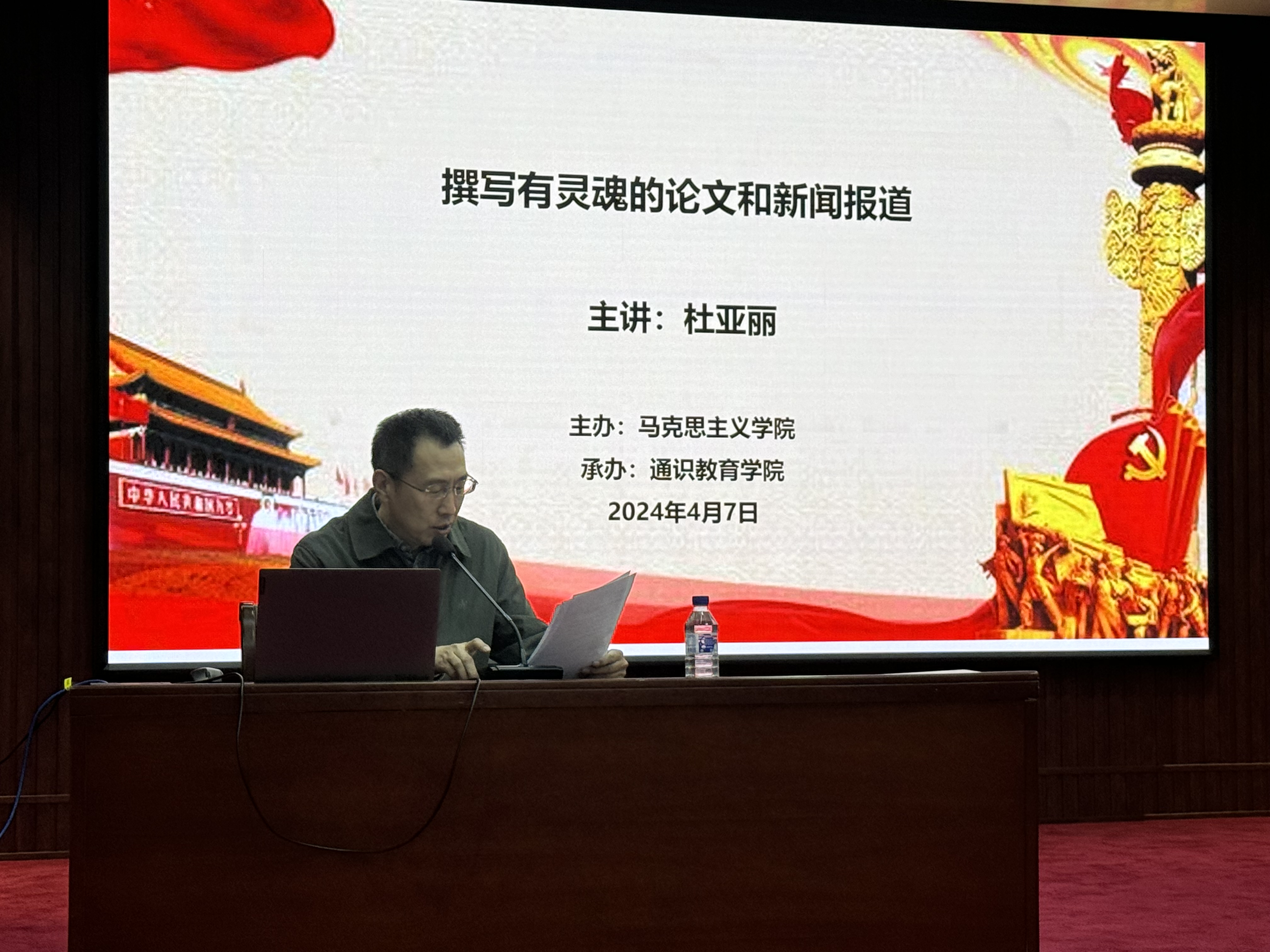 为了助力马克思主义学院教师教科研能力与专业写作水平提升,落实《吉林动画学院教科研工作高质量发展规划纲要》,贯彻中办和国办《关于深化新时代学校思想政治理论课改革创新的若干意见》,持续推动思想政治理论课改革创新,2024年4月7日在文化艺术中心三楼长白厅举办了由马克思主义学院、通识教育学院及力行职业发展学院主办,面向全校教师的一场专题讲座。讲座由吉林教育杂志社社长、中国教育报吉林记者站站长杜亚丽博士主讲,题为“撰写有灵魂的论文和新闻报道”。讲座由马克思主义学院院长臧平教授主持。