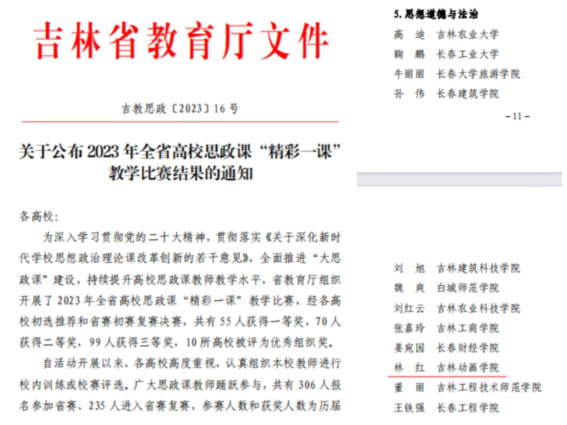为深入学习贯彻党的二十大精神,贯彻落实中共中央办公厅、国务院办公厅《关于深化新时代学校思想政治理论课改革创新的若干意见》,全面推进“大思政课”建设,持续提升高校思政课教师教学水平,充分展示我省高校思政课改革创新成果,吉林省教育厅于23年6月至9月间开展了全省高校思政课“精彩一课”教学比赛。