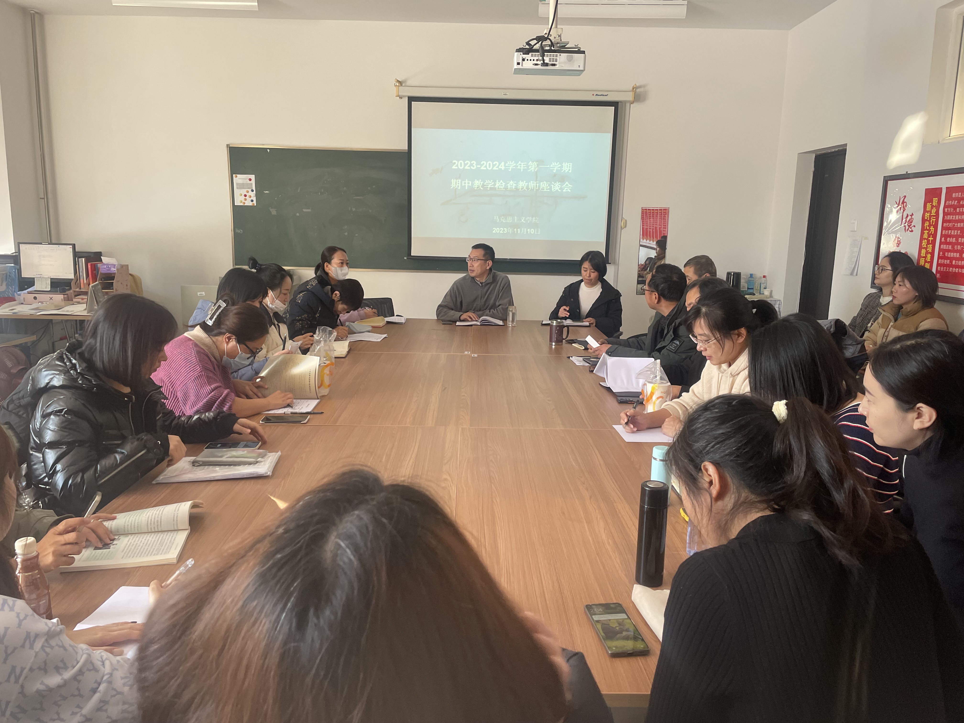 为着力提升教师教学水平,助成长,促融入,加强思政课和思政课教师队伍建设,2023年11月10日下午14:00,马克思主义学院在B409大会议室召开2023-2024学年第一学期期中教学检查之教师座谈会。马克思主义学院臧平院长、秦艺书院长助理及马克思主义学院全体专职教师参加。会议由马克思主义学院孙颖副院长主持。