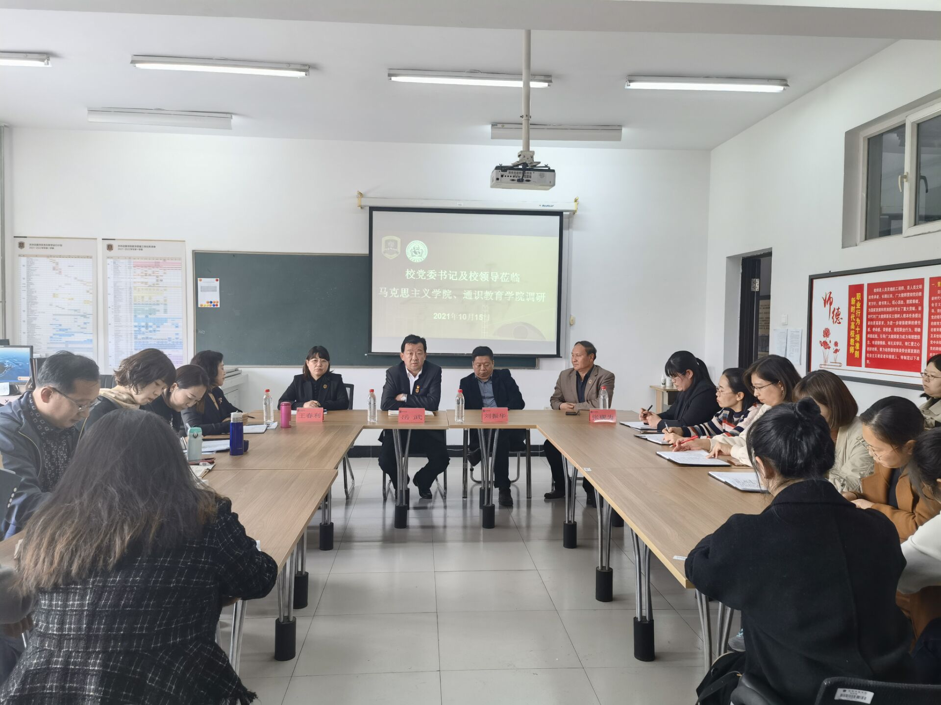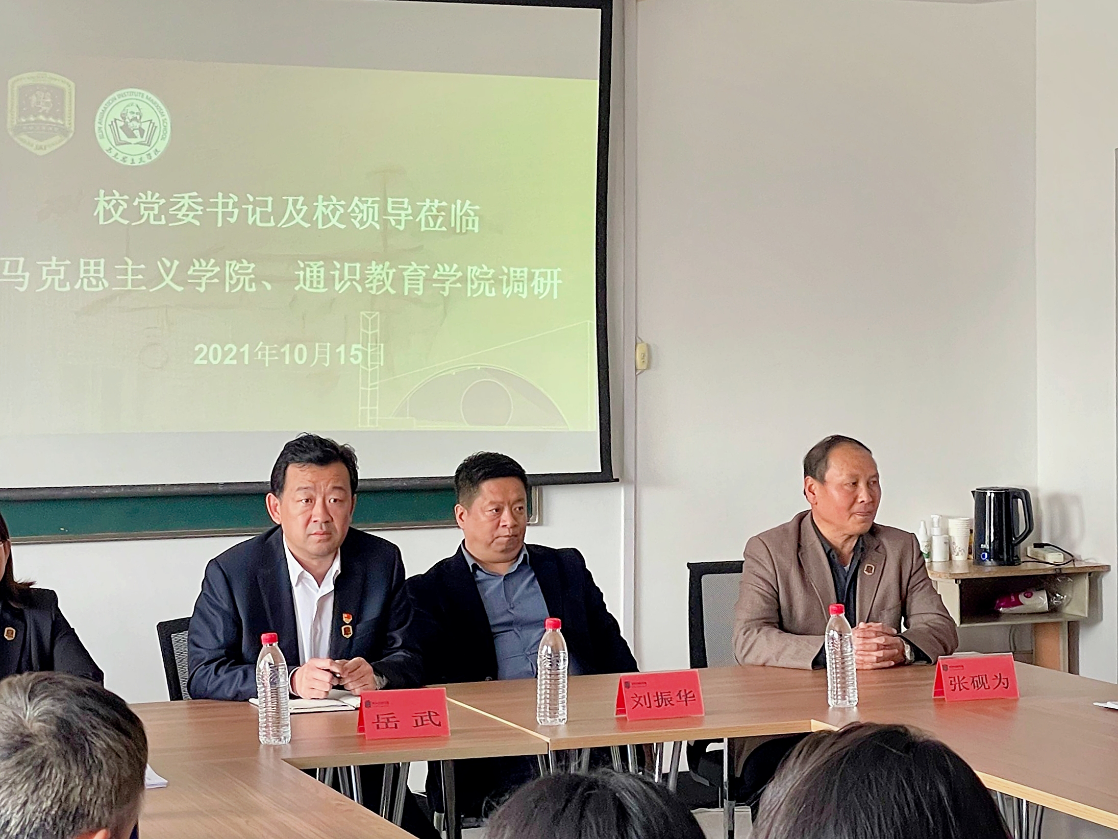 为了进一步加强马克思主义学院、通识教育学院建设,夯实思政课程、课程思政在大思政体系建设中的支柱作用,2021年10月15日14:00校党委书记岳武、常务副校长刘振华、副校长王春利、副校长张砚为莅临学院实地,在B409会议室与马克思主义学院院长魏英莉、通识教育学院副院长周海燕及两院教师展开座谈调研。调研会由魏英莉院长主持。