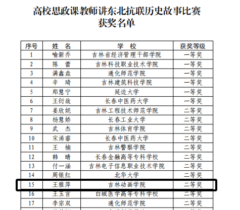 近日,吉林省教育厅正式公布“高校思政课教师讲东北抗联历史故事比赛”获奖结果。历经学校推荐、初赛选拔、决赛展示等多轮严格评审,我校王雅萍老师凭借扎实的理论功底、生动的故事讲述与深刻的精神阐释,在众多参赛选手中脱颖而出,荣获二等奖,为学校赢得荣誉!